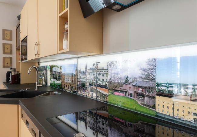 Für einen Privatkunden haben wir diesen individuellen Fliesenspiegel für die Küche erstellt. Der Wunsch unseres Kunden war, seine selbstgemachten Bilder als Erinnerung aus seiner Heimat, als Fliesenspiegel in seiner Küche zu platzieren. Die Bilder wurden per Digitaldruck auf das Glas gedruckt. Der Fliesenspiegel lässt sich normal reinigen und die Bilder behalten Ihre Farbintensität und Qualität auch nach mehreren Jahren. Als besonderes Highlight haben wir unserem Kunden die Möglichkeit der indirekten Beleuchtung des Küchenspritzschutzes vorgestellt, welche bei unserem Kunden begeistert entgegengenommen wurde.